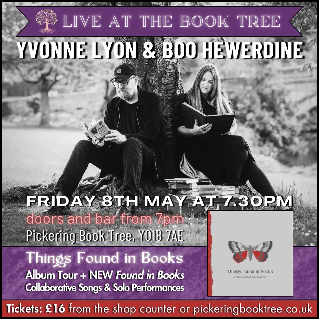 Pickering Book Tree 43a Market Place, PickeringJoin us in welcoming acclaimed singer-songwriters Yvonne Lyon and Boo Hewerdine to the Book Tree during their new tour for their beautiful co-created album, Things Found in Books. Haunting, nostalgic and sensitive, each song transports you into lives imagined from an object carried through time between the pages of a book. The show will include favourites from the album alongside new songs and solo performances for an evening not to be missed!